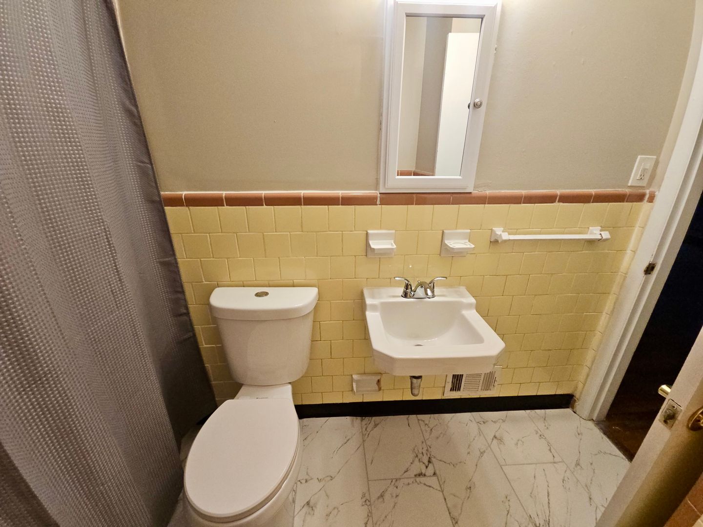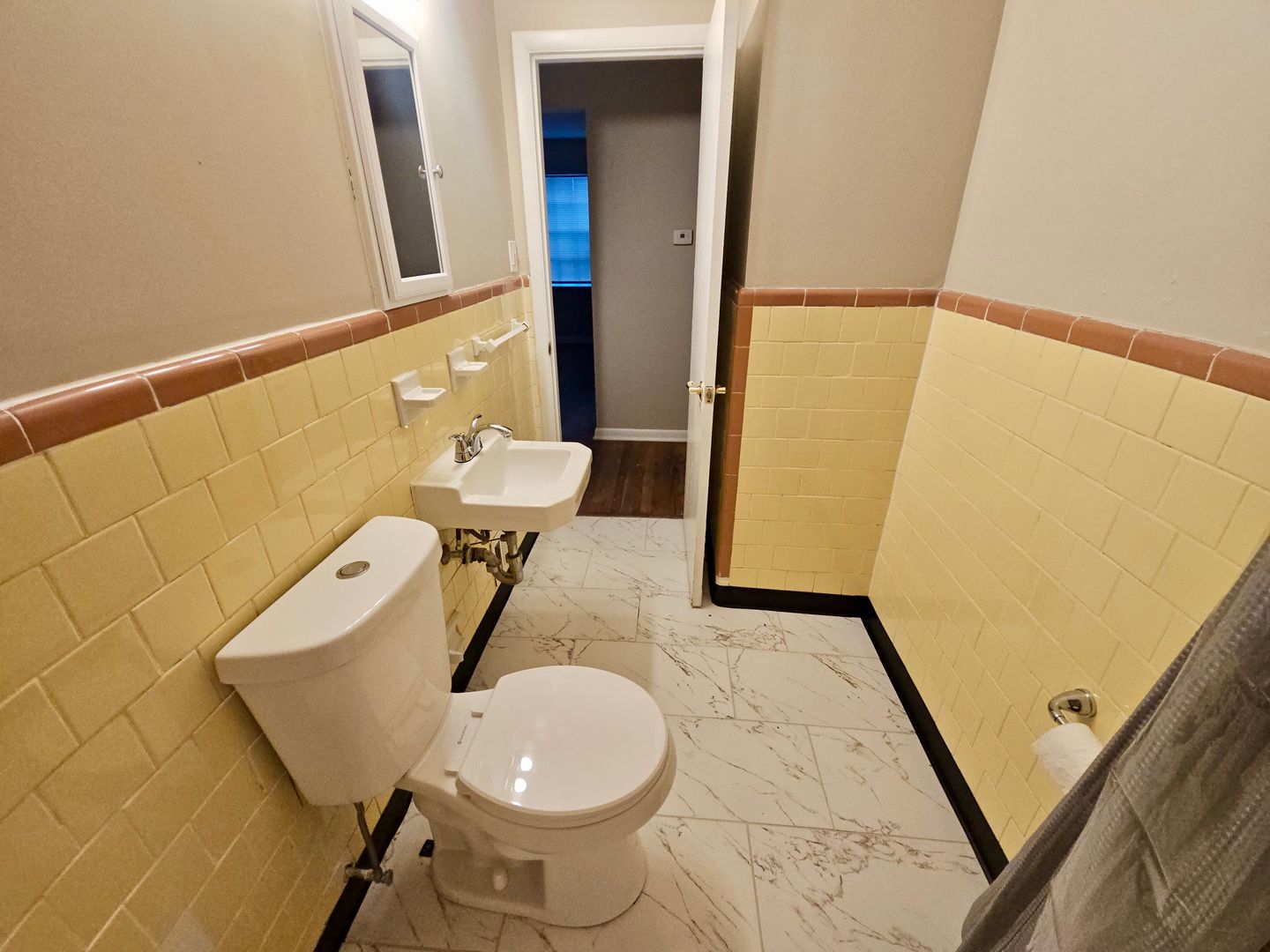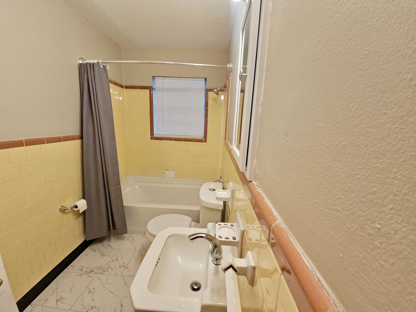 The interior features beautifully refurbished hardwood floors that bring warmth to the living areas, a stylish new marble-like bathroom tile floor, and tiled finishes in both the kitchen and bath.