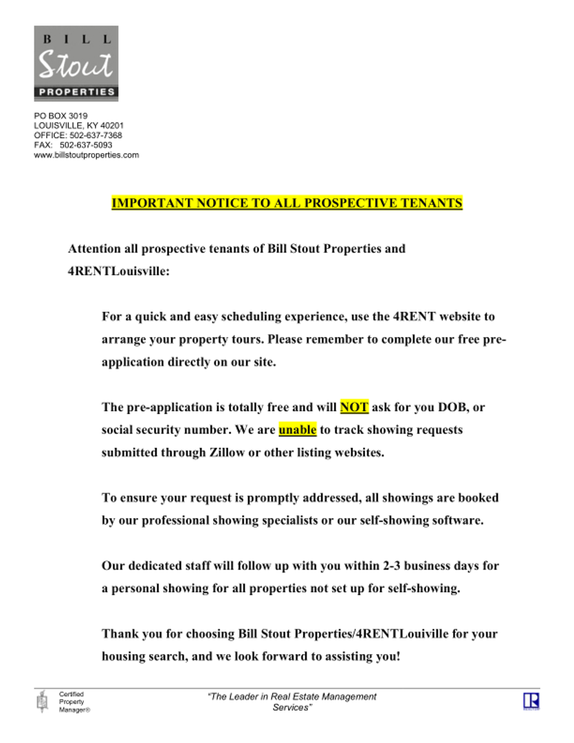 Professionally managed by Bill Stout Properties, Inc. and marketed by 4RentLouisville, LLC.